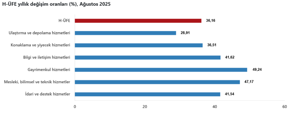 Türkiye İstatistik Kurumu (TÜİK) Ağustos 2025 itibarıyla Hizmet Üretici Fiyat Endeksi (H-ÜFE) verilerini açıkladı. Buna göre, H-ÜFE yıllık %36.16 artarken bu oran endeksin alt kırılımlarından gayrimenkul sektöründe %49.24 olarak gerçekleşti.