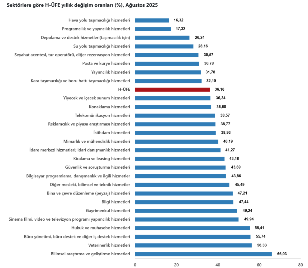 Bir önceki yılın aynı ayına göre, ulaştırma ve depolama hizmetlerinde %28,91 artış, konaklama ve yiyecek hizmetlerinde %36,51 artış, bilgi ve iletişim hizmetlerinde %41,62 artış, gayrimenkul hizmetlerinde %49,24 artış, mesleki, bilimsel ve teknik hizmetlerde %47,17 artış, idari ve destek hizmetlerde %41,54 artış gerçekleşti.