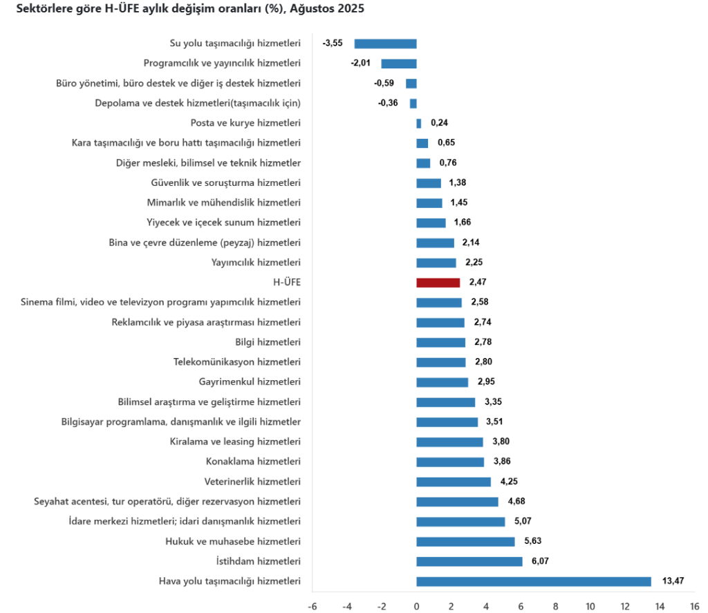 Bir önceki aya göre, ulaştırma ve depolama hizmetlerinde %1,91 artış, konaklama ve yiyecek hizmetlerinde %2,35 artış, bilgi ve iletişim hizmetlerinde %3,01 artış, gayrimenkul hizmetlerinde %2,95 artış, mesleki, bilimsel ve teknik hizmetlerde %3,23 artış, idari ve destek hizmetlerde %3,17 artış gerçekleşti.