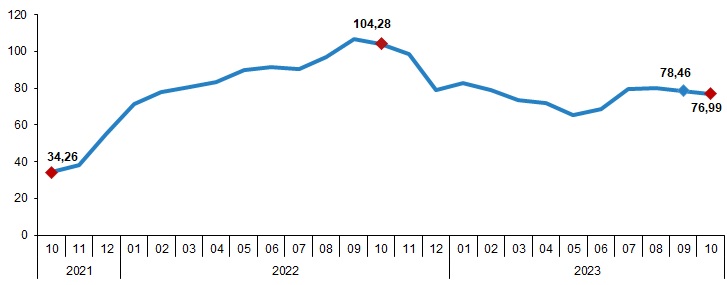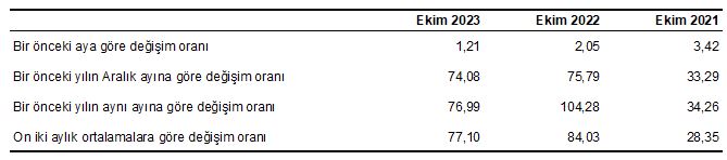 H-ÜFE 2023 yılı Ekim ayında bir önceki aya göre %1,21, bir önceki yılın Aralık ayına göre %74,08, bir önceki yılın aynı ayına göre %76,99 ve on iki aylık ortalamalara göre %77,10 artış gösterdi.