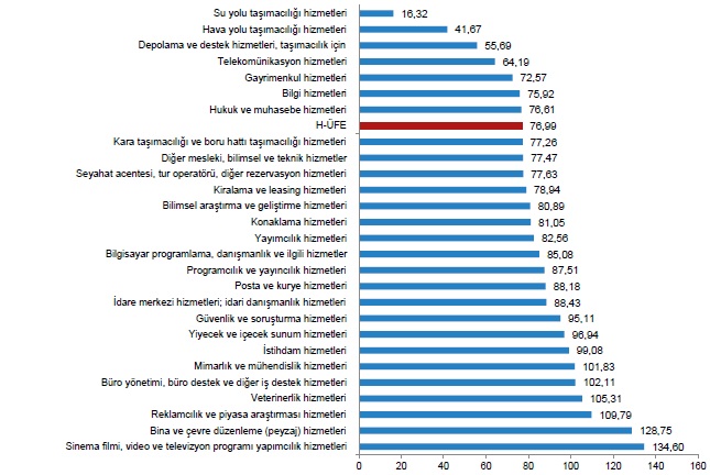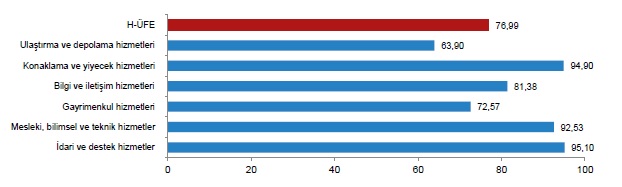 H-ÜFE sektörlerinden su yolu taşımacılığı hizmetleri %16,32, hava yolu taşımacılığı hizmetleri %41,67, depolama ve destek hizmetleri (taşımacılık için) %55,69 ile endekslerin en az arttığı alt sektörler oldu. Buna karşılık sinema filmi, video ve televizyon programı yapımcılık hizmetleri %134,60, bina ve çevre düzenleme (peyzaj) hizmetleri %128,75, reklamcılık ve piyasa araştırması hizmetleri %109,79 ile endekslerin en fazla arttığı alt sektörler oldu.