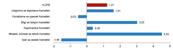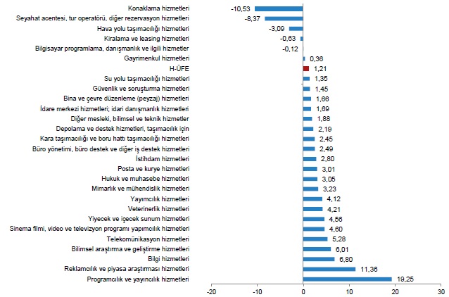 H-ÜFE sektörlerinden konaklama hizmetleri %10,53, seyahat acentesi, tur operatörü, diğer rezervasyon hizmetleri ve ilgili hizmetler %8,37, hava yolu taşımacılığı hizmetleri %3,09 ile endekslerin en fazla azalış gösterdiği alt sektörler oldu. Buna karşılık programcılık ve yayıncılık hizmetleri %19,25, reklamcılık ve piyasa araştırması hizmetleri %11,36, bilgi hizmetleri %6,80 ile endekslerin en fazla arttığı alt sektörler oldu.