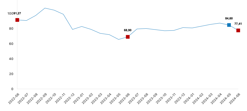 H-ÜFE 2024 yılı Haziran ayında bir önceki aya göre %5,30 artış, bir önceki yılın Aralık ayına göre %37,96 artış, bir önceki yılın aynı ayına göre %77,41 artış ve on iki aylık ortalamalara göre %81,16 artış gösterdi.