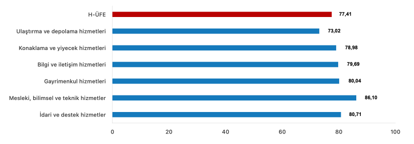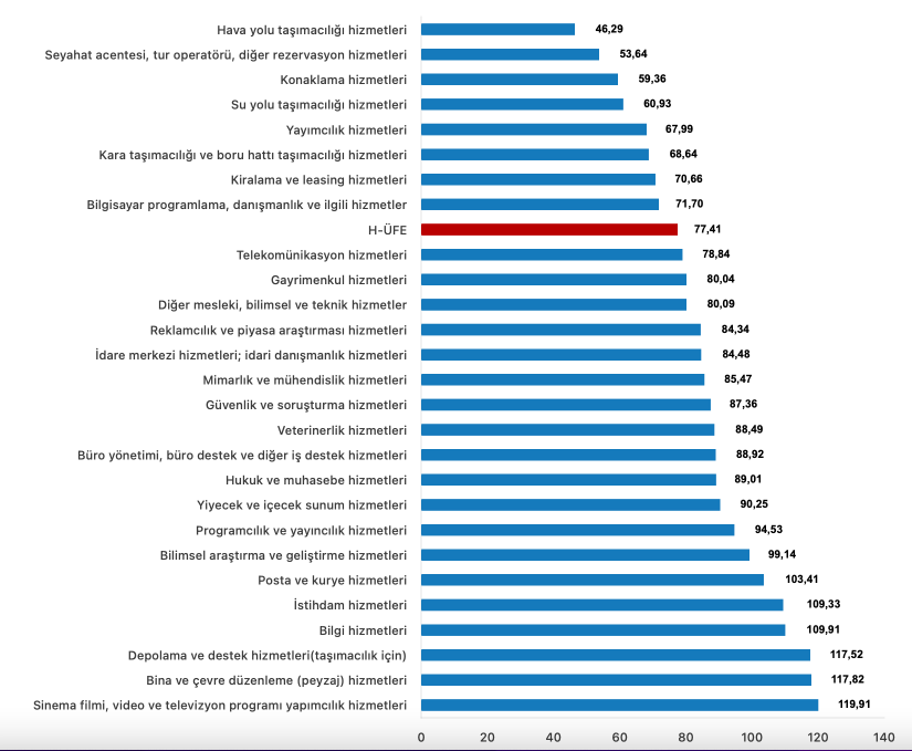 Bir önceki yılın aynı ayına göre, ulaştırma ve depolama hizmetlerinde %73,02 artış, konaklama ve yiyecek hizmetlerinde %78,98 artış, bilgi ve iletişim hizmetlerinde %79,69 artış, gayrimenkul hizmetlerinde %80,04 artış, mesleki, bilimsel ve teknik hizmetlerde %86,10 artış, idari ve destek hizmetlerde %80,71 artış gerçekleşti.