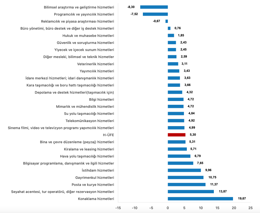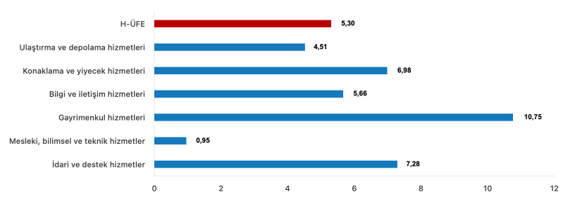 Bir önceki aya göre, ulaştırma ve depolama hizmetlerinde %4,51 artış, konaklama ve yiyecek hizmetlerinde %6,98 artış, bilgi ve iletişim hizmetlerinde %5,66 artış, gayrimenkul hizmetlerinde %10,75 artış, mesleki, bilimsel ve teknik hizmetlerde %0,95 artış, idari ve destek hizmetlerde %7,28 artış gerçekleşti.