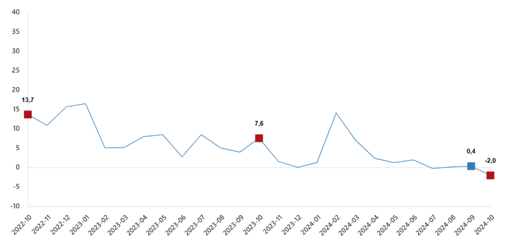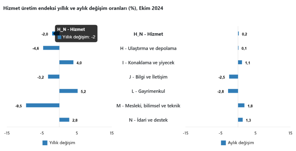 Hizmet üretim endeksi (2021=100) 2024 yılı Ekim ayında bir önceki yılın aynı ayına göre %2,0 azaldı. Aynı ayda ulaştırma ve depolama hizmetleri %4,6 azaldı, konaklama ve yiyecek hizmetleri %4,0 arttı, bilgi ve iletişim hizmetleri %3,2 azaldı, gayrimenkul hizmetleri %5,2 arttı, mesleki, bilimsel ve teknik hizmetler %9,5 azaldı, idari ve destek hizmetleri ise %2,8 arttı.