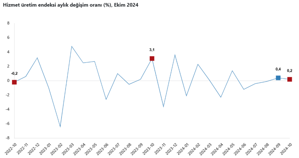 Hizmet üretim endeksi (2021=100) 2024 yılı Ekim ayında bir önceki aya göre %0,2 arttı. Aynı ayda ulaştırma ve depolama hizmetleri %0,1 arttı, konaklama ve yiyecek hizmetleri %1,1 arttı, bilgi ve iletişim hizmetleri %2,5 azaldı, gayrimenkul hizmetleri %2,8 azaldı, mesleki, bilimsel ve teknik hizmetler %1,8 arttı, idari ve destek hizmetleri ise %1,3 arttı.