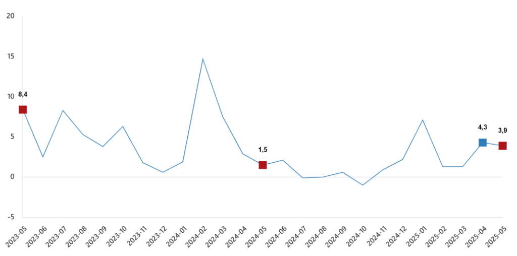 Hizmet üretim endeksi yıllık ve aylık değişim oranları (%), Mayıs 2025