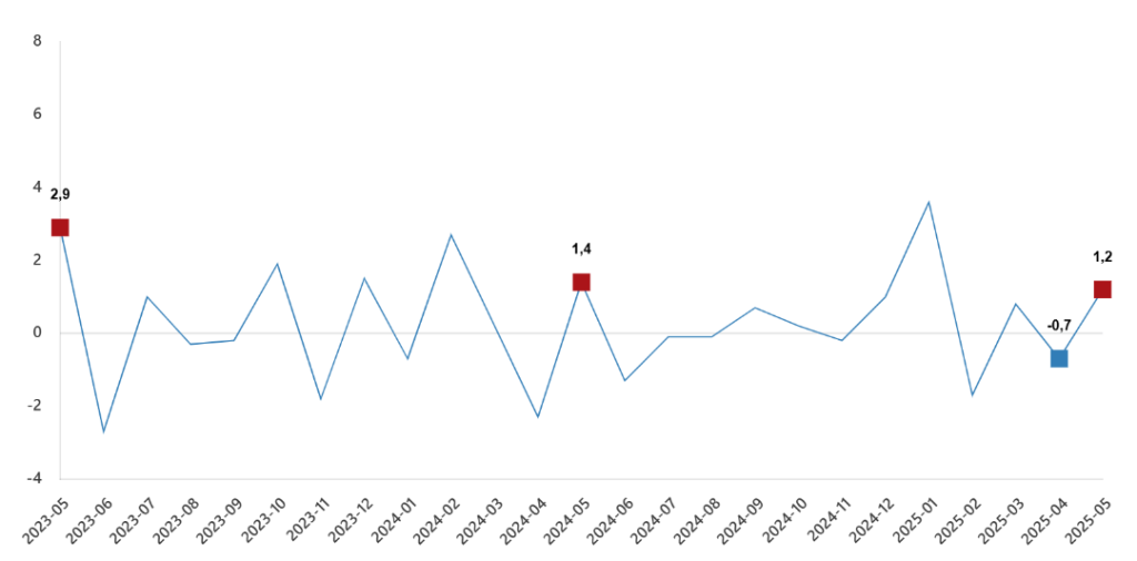 Hizmet üretim endeksi aylık değişim oranı (%), Mayıs 2025