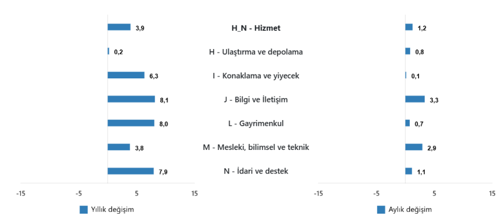 Hizmet üretim endeksi (2021=100) 2025 yılı Mayıs ayında bir önceki aya göre %1,2 arttı. Aynı ayda ulaştırma ve depolama hizmetleri %0,8 arttı, konaklama ve yiyecek hizmetleri %0,1 arttı, bilgi ve iletişim hizmetleri %3,3 arttı, gayrimenkul hizmetleri %0,7 arttı, mesleki, bilimsel ve teknik hizmetler %2,9 arttı, idari ve destek hizmetleri ise %1,1 arttı.