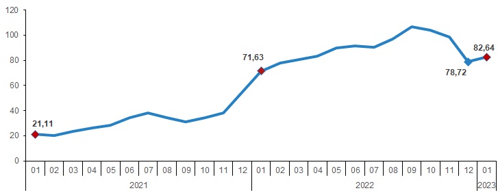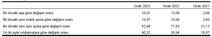 2023 yılı Ocak ayında H-ÜFE (2017=100) bir önceki aya göre %15,57, bir önceki yılın Aralık ayına göre %15,57, bir önceki yılın aynı ayına göre %82,64 ve on iki aylık ortalamalara göre %90,32 artış gösterdi.