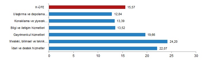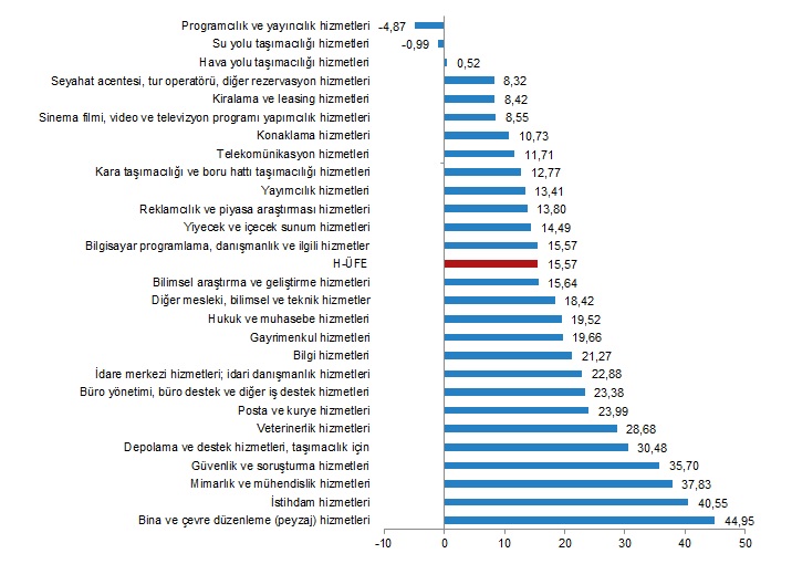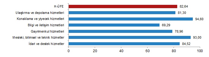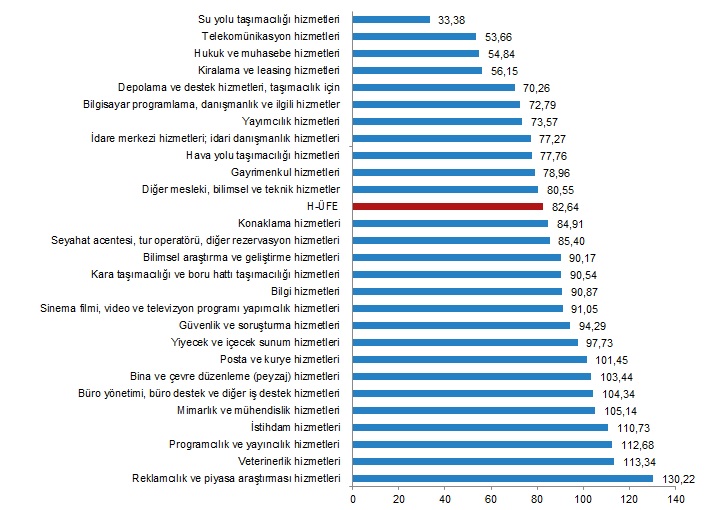 H-ÜFE sektörlerinden su yolu taşımacılığı hizmetleri %33,38, telekomünikasyon hizmetleri %53,66, hukuk ve muhasebe hizmetleri %54,84 ile endekslerin en az arttığı alt sektörler oldu. Buna karşılık reklamcılık ve piyasa araştırması hizmetleri %130,22, veterinerlik hizmetleri %113,34, programcılık ve yayıncılık hizmetleri %112,68 ile endekslerin en fazla arttığı alt sektörler oldu.