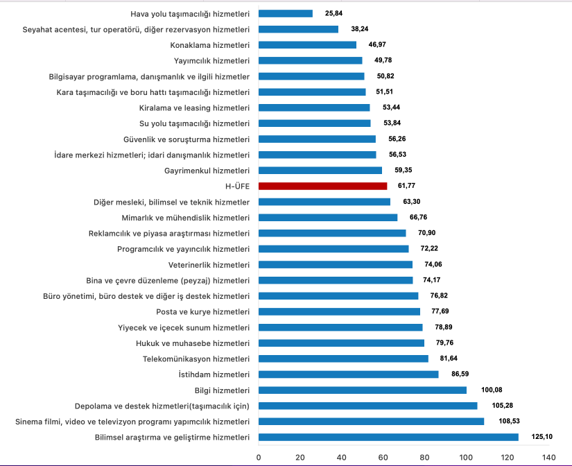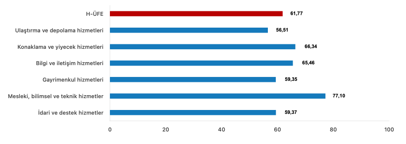 Bir önceki yılın aynı ayına göre, ulaştırma ve depolama hizmetlerinde %56,51 artış, konaklama ve yiyecek hizmetlerinde %66,34 artış, bilgi ve iletişim hizmetlerinde %65,46 artış, gayrimenkul hizmetlerinde %59,35 artış, mesleki, bilimsel ve teknik hizmetlerde %77,10 artış, idari ve destek hizmetlerde %59,37 artış gerçekleşti.