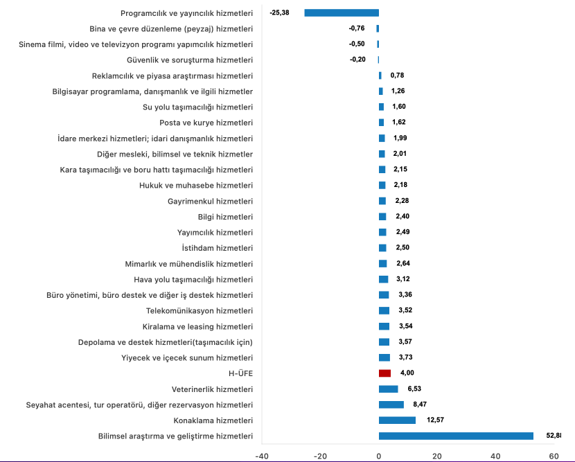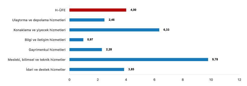 Bir önceki aya göre, ulaştırma ve depolama hizmetlerinde %2,46 artış, konaklama ve yiyecek hizmetlerinde %6,33 artış, bilgi ve iletişim hizmetlerinde %0,97 artış, gayrimenkul hizmetlerinde %2,28 artış, mesleki, bilimsel ve teknik hizmetlerde %9,78 artış, idari ve destek hizmetlerde %3,85 artış gerçekleşti.