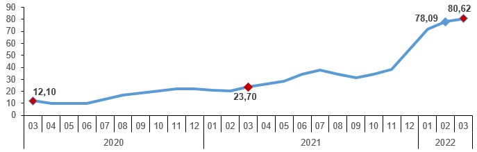 H-ÜFE (2017=100)  2022 yılı Mart ayında bir önceki aya göre %5,44, bir önceki yılın Aralık ayına göre %23,74, bir önceki yılın aynı ayına göre %80,62 ve on iki aylık ortalamalara göre %46,72 artış gösterdi.