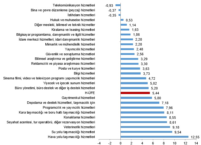 H-ÜFE’de aylık en fazla azalış gösteren alt sektörler %0,93 ile telekomünikasyon hizmetleri, %0,37 ile bina ve çevre düzenleme (peyzaj) hizmetleri, %0,35 ile istihdam hizmetleri oldu. Buna karşılık hava yolu taşımacılığı hizmetleri %12,55, su yolu taşımacılığı hizmetleri %9,54, veterinerlik hizmetleri %9,18 ile endekslerin en fazla arttığı alt sektörler oldu.