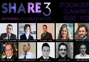 Gayrimenkul sektörünün deneyimli isimlerinin, tecrübelerini ve görüşlerini aktardığı bir platform haline gelen ‘SHARE’in üçüncü toplantısı 17 Ocak Cumartesi günü Levent’teki Kaleseramik binasında düzenleniyor. Birbirinden uzman yöneticilerin görüşlerini paylaşacağı toplantıya katılacak konuşmacılar şu isimlerden oluşuyor:  Erkin Şahinöz (Ekonomist), Şenay Azak Matt (AAreal Bank), Ali Hepşen (İstanbul Üniv), Pınar Ersin Kollu (İŞ GYO), Emre Çamlıbel (SOYAK), Anthony Khoi (CEFIC), Atilla Yıldıztekin (Lojistik), Sayat Delice (JLL), Selçuk Avcı (Avcı Architects), Öner Yılmaz (ARKITERA).