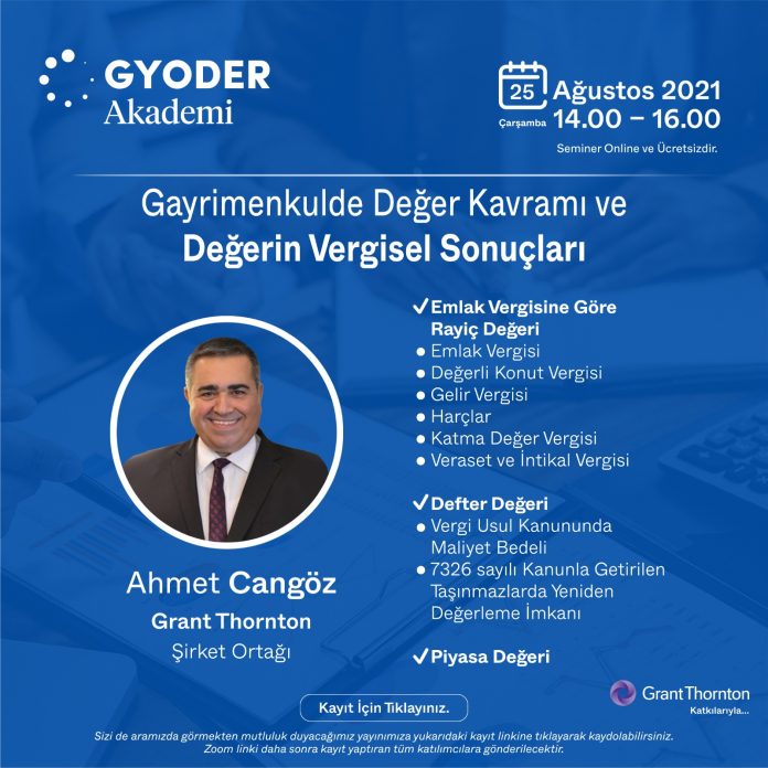GYODER Akademi tarafından 25 ağustos çarşamba günü 14.00-16.00 saatleri arasında online olarak gerçekleştirilecek olan ve katılımın ücretsiz olduğu “Gayrimenkulde Değer Kavramı ve Değerin Vergisel Sonuçları” seminerini Grant Thornton şirket ortağı Ahmet Cangöz verecek.