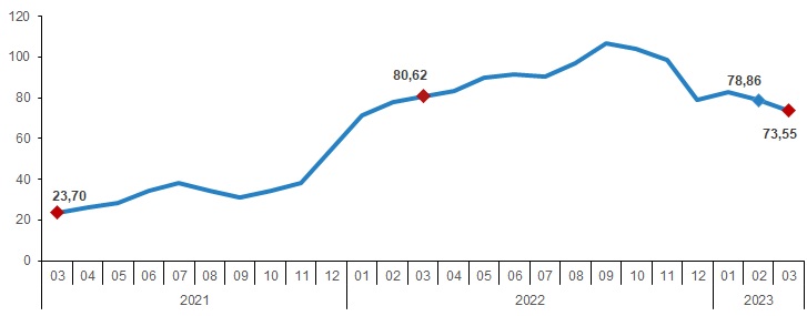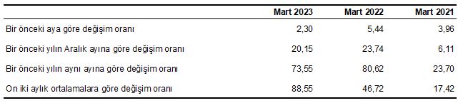 H-ÜFE 2023 yılı Mart ayında bir önceki aya göre %2,30, bir önceki yılın Aralık ayına göre %20,15, bir önceki yılın aynı ayına göre %73,55 ve on iki aylık ortalamalara göre %88,55 artış gösterdi.