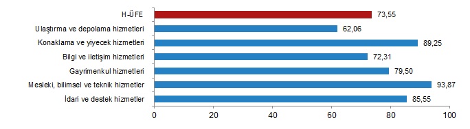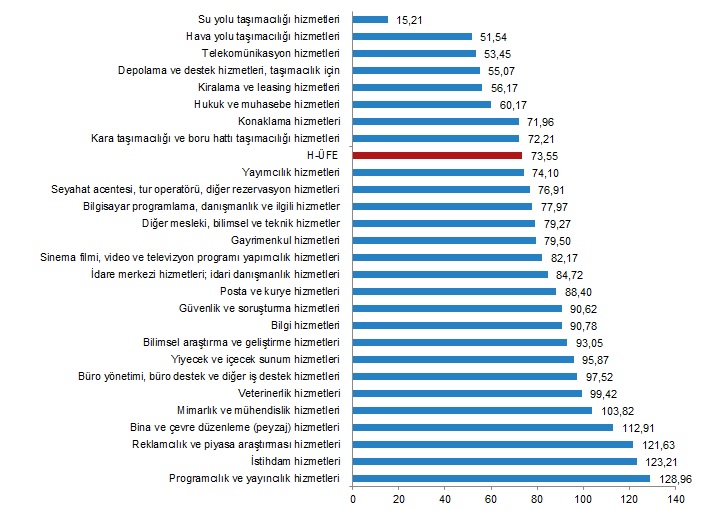 H-ÜFE sektörlerinden su yolu taşımacılığı hizmetleri %15,21, hava yolu taşımacılığı hizmetleri %51,54, telekomünikasyon hizmetleri %53,45 ile endekslerin en az arttığı alt sektörler oldu. Buna karşılık programcılık ve yayıncılık hizmetleri %128,96, istihdam hizmetleri %123,21, reklamcılık ve piyasa araştırması hizmetleri %121,63 ile endekslerin en fazla arttığı alt sektörler oldu.