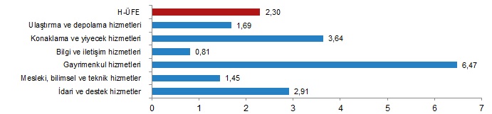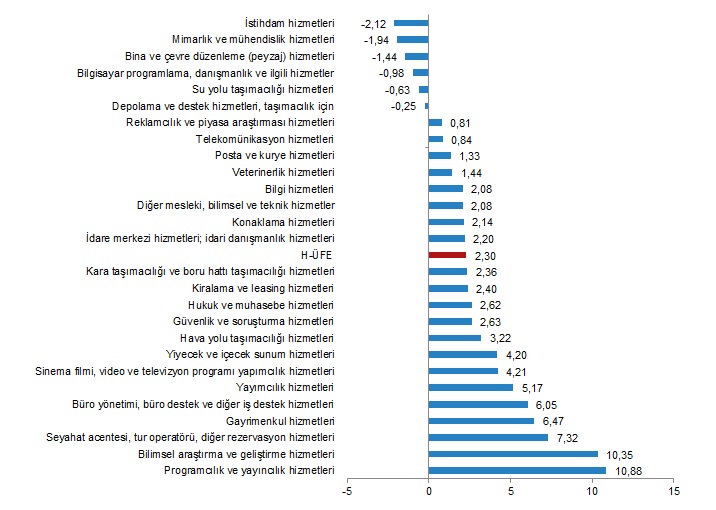 H-ÜFE sektörlerinden istihdam hizmetleri %2,12, mimarlık ve mühendislik hizmetleri; teknik test ve analiz hizmetleri %1,94, bina ve çevre düzenleme (peyzaj) hizmetleri %1,44 ile endekslerin en fazla azalış gösterdiği alt sektörler oldu. Buna karşılık programcılık ve yayıncılık hizmetleri %10,88, bilimsel araştırma ve geliştirme hizmetleri %10,35, seyahat acentesi, tur operatörü, diğer rezervasyon hizmetleri ve ilgili hizmetler %7,32 ile endekslerin en fazla arttığı alt sektörler oldu.