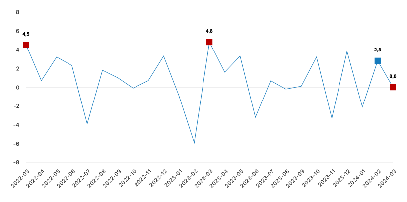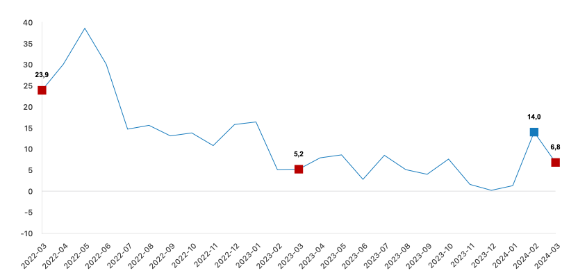 Hizmet üretim endeksi aylık değişim oranı (%), Mart 2024
