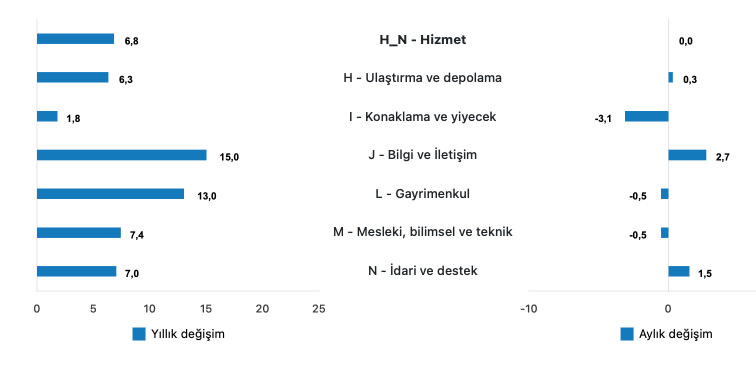 Hizmet üretim endeksi (2021=100) 2024 yılı Mart ayında bir önceki yılın aynı ayına göre %6,8 arttı. Aynı ayda ulaştırma ve depolama hizmetleri %6,3 arttı, konaklama ve yiyecek hizmetleri %1,8 arttı, bilgi ve iletişim hizmetleri %15,0 arttı, gayrimenkul hizmetleri %13,0 arttı, mesleki, bilimsel ve teknik hizmetler %7,4 arttı, idari ve destek hizmetleri ise %7,0 arttı.