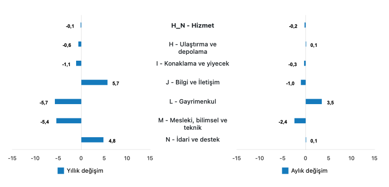Hizmet üretim endeksi (2021=100) 2024 yılı Temmuz ayında bir önceki yılın aynı ayına göre %0,1 azaldı. Aynı ayda ulaştırma ve depolama hizmetleri %0,6 azaldı, konaklama ve yiyecek hizmetleri %1,1 azaldı, bilgi ve iletişim hizmetleri %5,7 arttı, gayrimenkul hizmetleri %5,7 azaldı, mesleki, bilimsel ve teknik hizmetler %5,4 azaldı, idari ve destek hizmetleri ise %4,8 arttı.