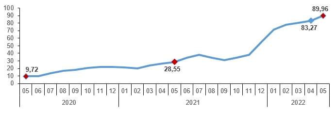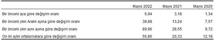 H-ÜFE (2017=100) 2022 yılı Mayıs ayında bir önceki aya göre %6,94, bir önceki yılın Aralık ayına göre %38,88, bir önceki yılın aynı ayına göre %89,96 ve on iki aylık ortalamalara göre %56,86 artış gösterdi.
