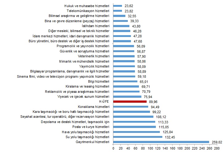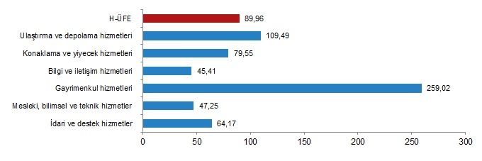 H-ÜFE sektörlerinden hukuk ve muhasebe hizmetleri %23,62, telekomünikasyon hizmetleri %23,82, bilimsel araştırma ve geliştirme hizmetleri %32,55 ile endekslerin en az arttığı alt sektörler oldu. Buna karşılık gayrimenkul hizmetleri %259,02, su yolu taşımacılığı hizmetleri %132,45, hava yolu taşımacılığı hizmetleri %125,84 ile endekslerin en fazla arttığı alt sektörler oldu.