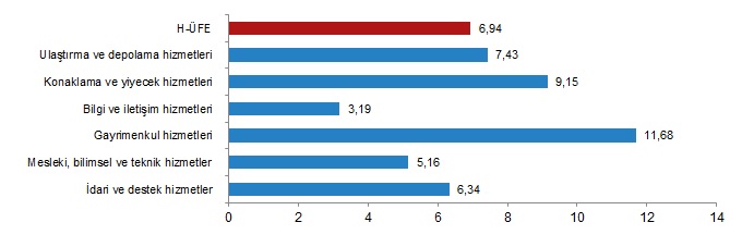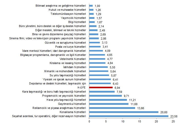 H-ÜFE sektörlerinden bilimsel araştırma ve geliştirme hizmetleri %1,00, hukuk ve muhasebe hizmetleri %1,26, telekomünikasyon hizmetleri %1,29 ile endekslerin en az arttığı alt sektörler oldu. Buna karşılık seyahat acentesi, tur operatörü, diğer rezervasyon hizmetleri ve ilgili hizmetler %23,58, konaklama hizmetleri %20,60, reklamcılık ve piyasa araştırması hizmetleri %13,66 ile endekslerin en fazla arttığı alt sektörler oldu.