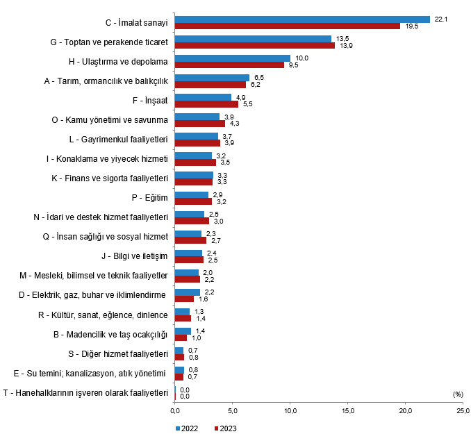 Üretim yöntemine göre cari fiyatlarla GSYH, 2023 yılında bir önceki yıla göre %76,8 artarak 26 trilyon 545 milyar 722 milyon TL oldu. Gayrisafi yurt içi hasılada en yüksek payı 2023 yılında %19,5 ile imalat sanayi aldı. İmalatı, %13,9 ile toptan ve perakende ticaret; motorlu kara taşıtlarının ve motosikletlerin onarımı ve %9,5 ile ulaştırma ve depolama sektörü izledi. Yıllık gayrisafi yurt içi hasılada en düşük pay hanehalklarının işverenler olarak faaliyetleri için gerçekleşti.