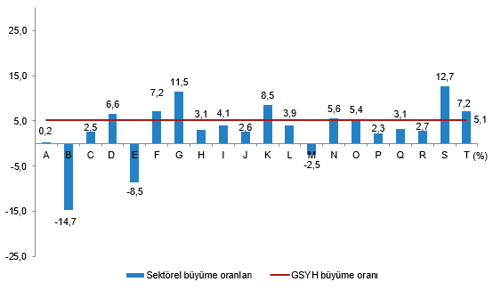 S-Diğer hizmet faaliyetleri %12,7, G-Toptan ve perakende ticaret; motorlu kara taşıtlarının ve motosikletlerin onarımı %11,5 ve K-Finans ve sigorta faaliyetleri % 8,5 ile 2023 yılında en çok büyüyen sektörler oldu. B-Madencilik ve taş ocakçılığı %14,7, E-Su temini; kanalizasyon, atık yönetimi ve iyileştirme faaliyetleri %8,5 ve M- Mesleki, bilimsel ve teknik faaliyetler %2,5 ile en çok küçülen sektörler oldu.