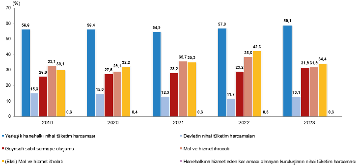Yerleşik hanehalkı nihai tüketim harcamaları 2023 yılında bir önceki yıl zincirlenmiş hacim endeksine göre %13,6 arttı. Yerleşik hanehalkı nihai tüketim harcamalarının cari değerlerle GSYH içindeki payı %59,1 oldu. Hanehalkı harcamalarında en yüksek payı alan harcama grupları sırasıyla, %22,8 ile gıda ve alkolsüz içecekler, %19,7 ile ulaştırma ve %11,1 ile konut, su, elektrik, gaz ve diğer yakıtlar oldu.