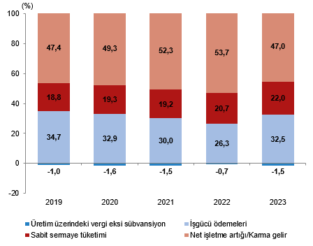 İşgücüne yapılan ödemelerin cari gayrisafi katma değer içindeki payı 2022 yılında %26,3 iken bu oran 2023 yılında %32,5 oldu. Net işletme artığı/karma gelirin payı ise 2022 yılında %53,7 iken 2023 yılında %47,0 oldu.