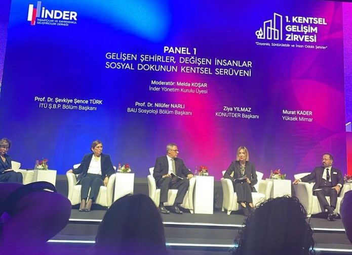 İNDER Yönetim Kurulu Üyesi Melda Koşar’ın moderatörlüğünü yaptığı birinci panelin konuşmacıları KONUTDER Başkanı Ziya Yılmaz, Yüksek Mimar Murat Kader, İTÜ ŞBP Bölüm Başkanı Prof. Dr. Şevkiye Şence Türk ve BAU Sosyoloji Bölüm Başkanı Prof. Dr. Nilüfer Narlı oldu.