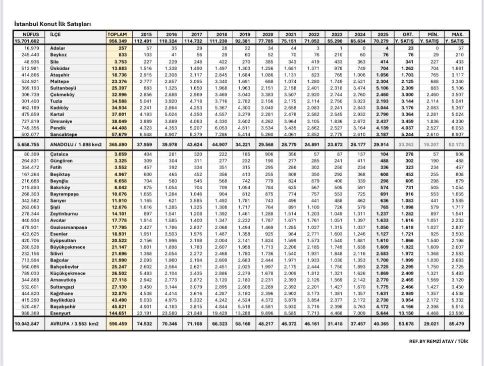GPPS – Gayrimenkul Proje Pazarlama ve Satış Platform Kurucusu, Bilge Özdemir; 2025 yılını ve son 10 yılın ilçeler ilk el konut satış referanslarını TÜİK tarafından ilçe bazlı değerlendirmelerin başladığı 2015 yılından itibaren Gayrimenkul Değerleme Uzmanı Remzi Atay referansı ile derleyerek sektörün hizmetine sunduklarını bildirdi.