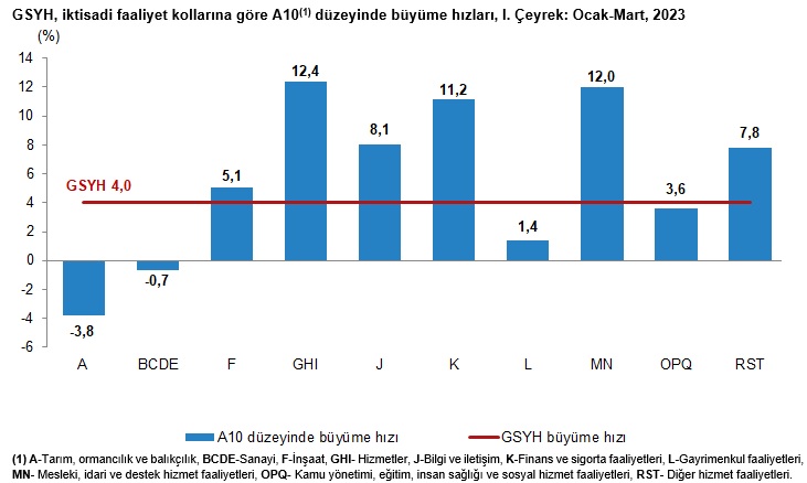 GSYH’yi oluşturan faaliyetler incelendiğinde; 2023 yılı birinci çeyreğinde bir önceki yıla göre zincirlenmiş hacim endeksi olarak; hizmetler %12,4, mesleki, idari ve destek hizmet faaliyetleri %12,0, finans ve sigorta faaliyetleri %11,2, bilgi ve iletişim faaliyetleri %8,1, diğer hizmet faaliyetleri %7,8, inşaat %5,1, kamu yönetimi, eğitim, insan sağlığı ve sosyal hizmet faaliyetleri %3,6 ve gayrimenkul faaliyetleri %1,4 arttı. Tarım sektörü %3,8, sanayi ise %0,7 azaldı.