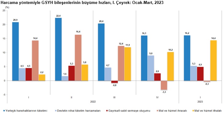Yerleşik hanehalklarının nihai tüketim harcamaları 2023 yılının birinci çeyreğinde bir önceki yılın aynı çeyreğine göre zincirlenmiş hacim endeksi olarak %16,2 arttı. Devletin nihai tüketim harcamaları %5,3, gayrisafi sabit sermaye oluşumu ise %4,9 arttı.
