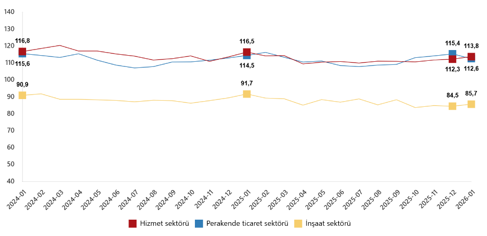 Mevsim etkilerinden arındırılmış güven endeksi Ocak ayında bir önceki aya göre; hizmet sektöründe %1,3 oranında artarak 113,8 değerini, perakende ticaret sektöründe %2,4 oranında azalarak 112,6 değerini ve inşaat sektöründe %1,5 oranında artarak 85,7 değerini aldı.