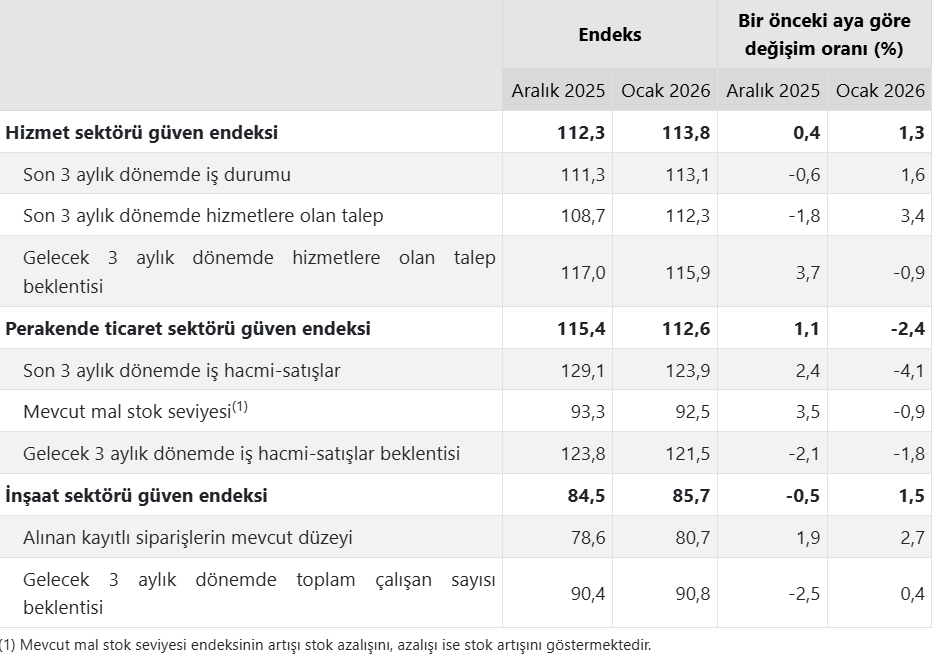 Türkiye İstatistik Kurumu (TÜİK) Ocak 2026 itibarıyla Hizmet, Perakende Ticaret ve İnşaat Güven Endekslerini açıkladı. Buna göre, Güven Endeksi hizmet sektöründe %1.3 arttı, perakende ticaret sektöründe %2.4 azaldı, inşaat sektöründe %1.5 arttı.