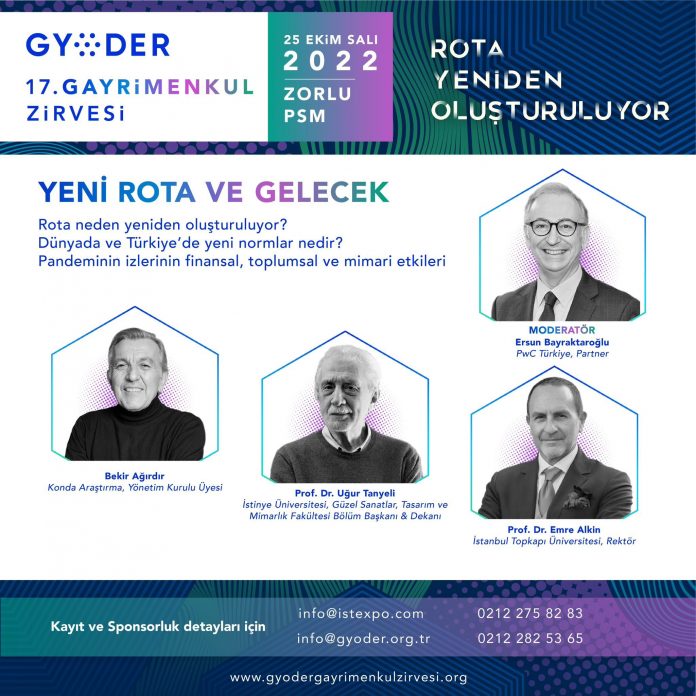 GYODER tarafından 2000 yılından bu yana düzenlenen Gayrimenkul Zirvesi, bu yıl 17. Kez “Rota Yeniden Oluşturuluyor” mottosuyla 25 Ekim 2022’de Zorlu PSM’de gerçekleşecek. Zirvede sektöre dair birçok yenilik paylaşılırken, GYODER’in erişilebilir konut modeli ile ilgili çalışmasının detayları da kamuoyu ile paylaşılacak.