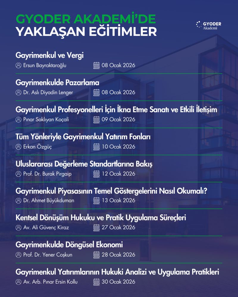 Gayrimenkul sektörüne özel olarak hazırlanan GYODER Akademi programı, sektör profesyonellerinin gelişim ihtiyaçlarına yanıt veren kapsamlı ve uygulamaya yönelik eğitim içerikleri sunuyor. Katılımcılar, güncel bilgiler ışığında uzmanlaşma ve yetkinliklerini güçlendirme fırsatı elde edecek.