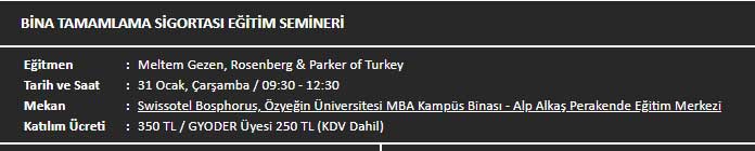 Bu eğitim semineri ile Rosenberg & Parker Türkiye CEO’su Meltem Gezen tarafından Bina Tamamlama Sigortası’nın kapsamı, koşulları, uygulama esasları ve temini hakkında bilgi aktarımı hedeflenmektedir.