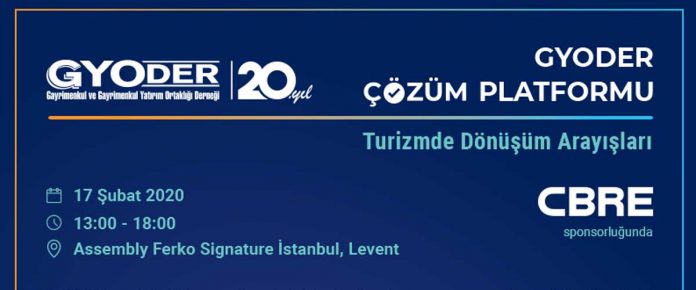 CBRE sponsorluğunda gerçekleştirilecek olan ve Turizmde dönüşümün konuşulacağı GYODER Çözüm Platformu toplantısı 17 şubat pazartesi günü 13.00-18.00 saatleri arasında Levent’teki Assembly Ferko Signature’da gerçekleştirilecek.