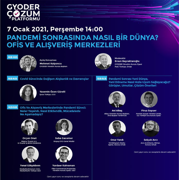 Türkiye gayrimenkul sektörünün çatı örgütü GYODER, mevcut sorunlara çözüm bulmak amacıyla hayata geçirdiği ‘GYODER Çözüm Platformu, bu sene Alkaş iş birliği ile sektörün gündemindeki konuları değerlendirmeye devam ediyor. Gayrimenkul sektörü ve iş dünyasından deneyimli isimlerin konuşmacı olarak katılacağı Çözüm Platformu toplantısında ‘Pandemi sonrasında nasıl bir dünya? Ofis ve Alışveriş Merkezleri’ başlığı altında son gelişmeler ele alınacak.