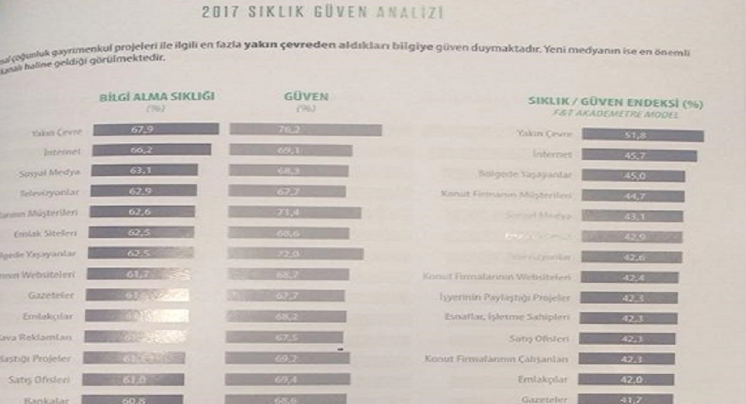 Bu alanda emlak haber sitelerini yüzde 62,5 gibi önemli bir payı bulunuyor. Ayrıca, bilgilere güvende emlak haber sitelerinin güvenirliğinin yüzde 68,6 olması da konut almak isteyenler üzerinde bu sitelerdeki bilgilerin etkisini gösteren bir başka önemli veri olarak karşımıza çıkıyor. Bu alanda emlak haber siteleri gazetelerin bile önünde yer alıyor.