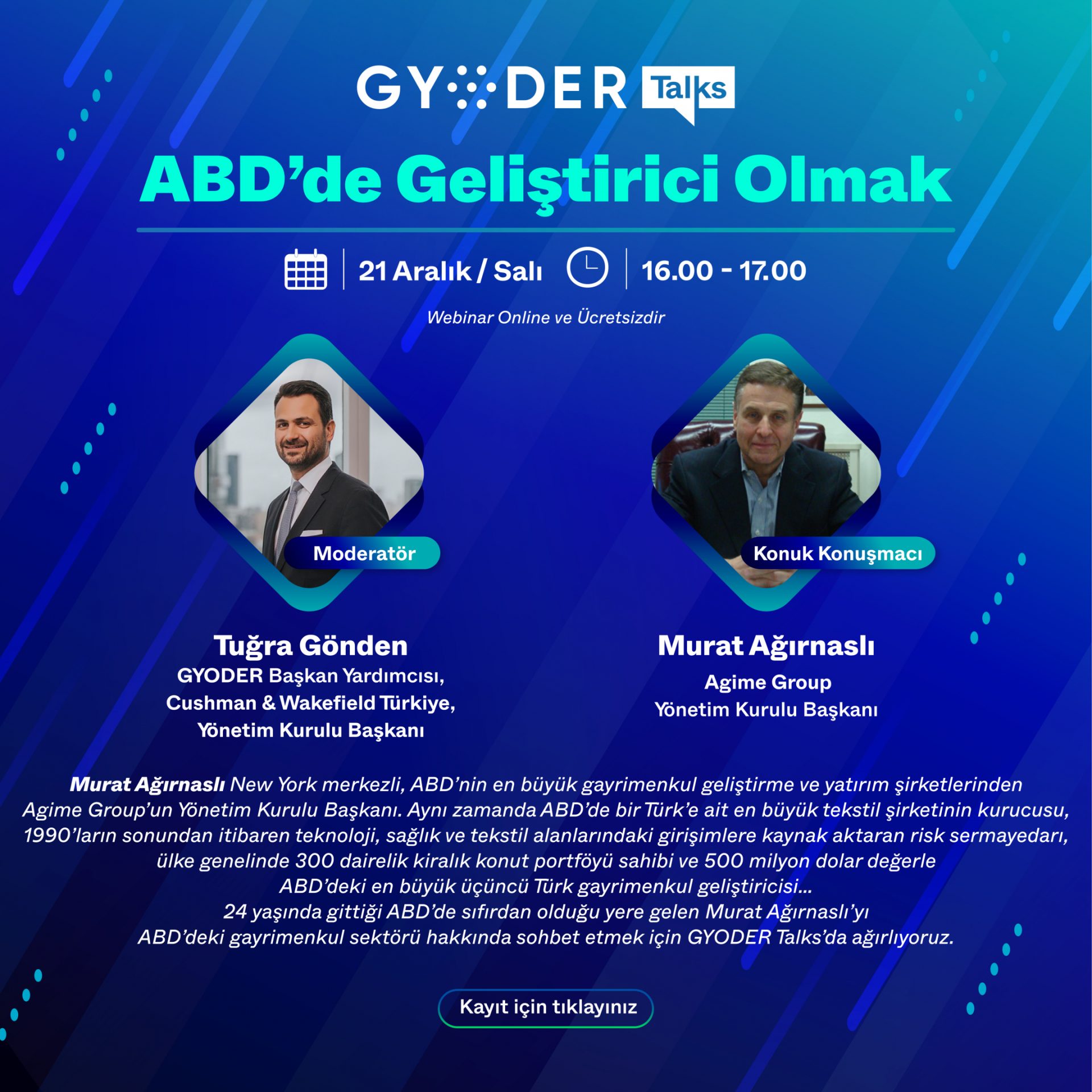 21 aralık salı günü Webinar üzerinden online ve ücretsiz olarak gerçekleştirilecek etkinliğin moderatörlüğünü GYODER Başkan Yardımcısı ve Cushman & Wakefield Türkiye Yönetim Kurulu Başkanı Tuğra Gönden yapacak. Konuk konuşmacı ise Agime Group Yönetim Kurulu Başkanı Murat Ağırnaslı olacak.
