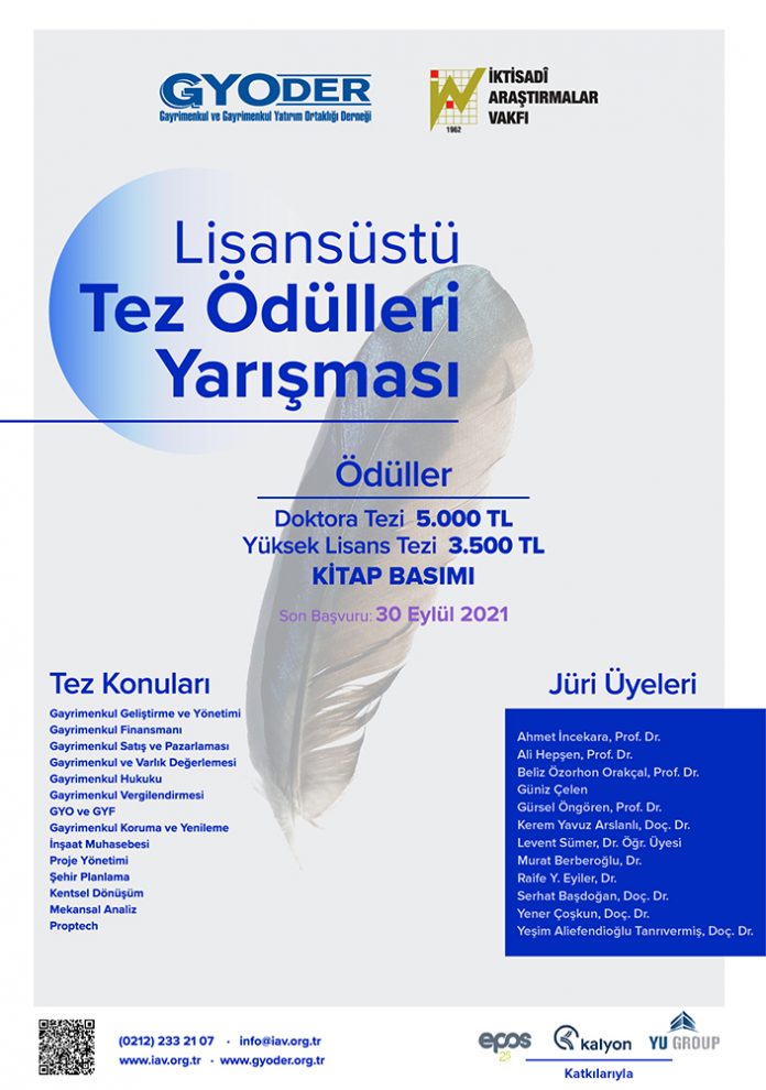 Gayrimenkul ve Gayrimenkul Yatırım Ortaklığı Derneği (GYODER) ile İktisadi Araştırmalar Vakfı (İAV) işbirliğinde düzenlenen “Lisansüstü Tez Ödülleri Yarışması” için başvurular 30 Eylül 2021 tarihine kadar devam edecek.