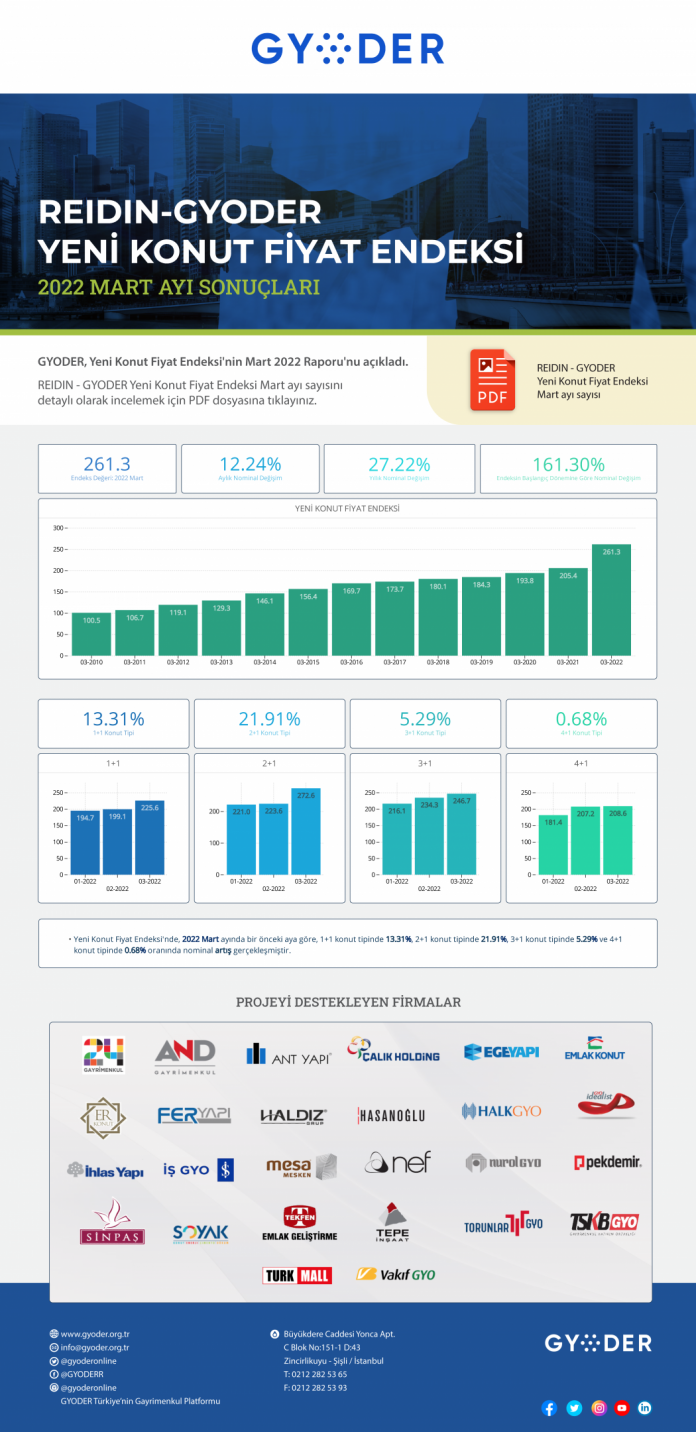 REIDIN-GYODER Yeni Konut Fiyat Endeksi sonuçlarına göre, 2022 Mart ayında bir önceki aya göre 12.24%, geçen yılın aynı dönemine göre 27.22% ve endeksin başlangıç dönemi olan 2010 yılı Ocak ayına göre ise 161.30% oranında nominal artış gerçekleşmiştir.